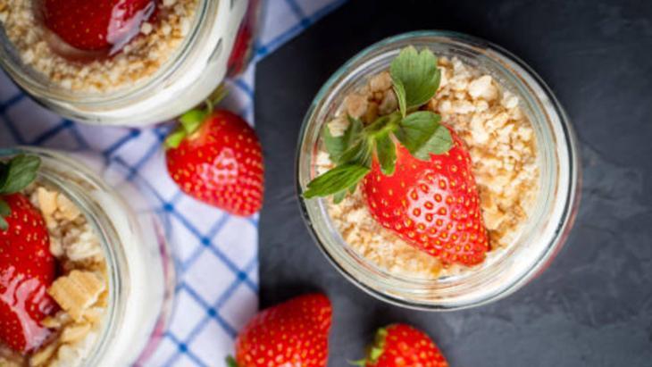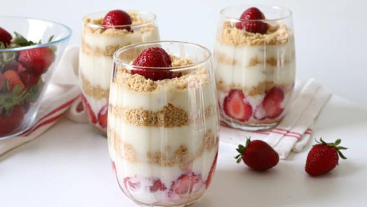Muhallebi soğuduktan sonra, içine bir paket krema ekleyip edip mikser yardımıyla çırpın. Çilekleri ince dilimler halinde kesmelisiniz. Kupların en tabanına 1 yemek kaşığı bisküvi ekleyip. Kenarlarına çilek dizmek için tatlı yeri hazırlayın.