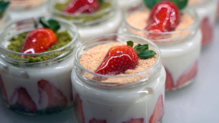 Muhallebi soğuduktan sonra, içine bir paket krema ekleyip edip mikser yardımıyla çırpın. Çilekleri ince dilimler halinde kesmelisiniz. Kupların en tabanına 1 yemek kaşığı bisküvi ekleyip. Kenarlarına çilek dizmek için tatlı yeri hazırlayın.