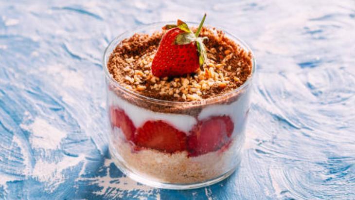 Muhallebi soğuduktan sonra, içine bir paket krema ekleyip edip mikser yardımıyla çırpın. Çilekleri ince dilimler halinde kesmelisiniz. Kupların en tabanına 1 yemek kaşığı bisküvi ekleyip. Kenarlarına çilek dizmek için tatlı yeri hazırlayın.