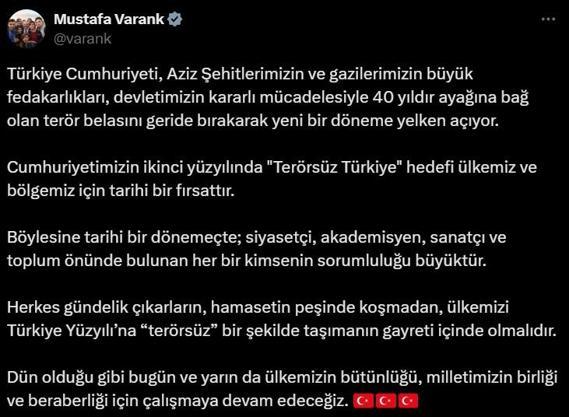 Sosyal medya hesabı X’ten açıklama yapan Varank şu sözleri kullandı; Türkiye Cumhuriyeti, Aziz Şehitlerimizin ve gazilerimizin büyük fedakarlıkları, devletimizin kararlı gayretiyle 40 yıldır ayağına bağ olan terör belasını geride bırakarak yeni bir periyoda yelken açıyor.