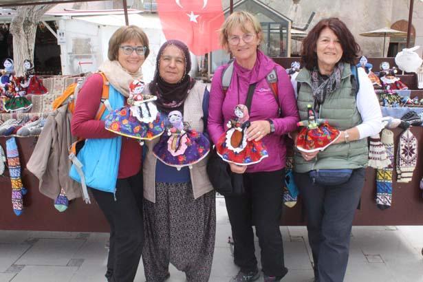 Ayşe Aplak, “Turist dönemimiz çok âlâ başladı. İnşallah bu türlü devam eder. Sabah 9’da standa geliyoruz. Turistler geliyor, bebekleri alıyor. Turistler gidince arkadaşlarla birlikte gözleme yapıyoruz, satıyoruz. Sonra konut işlerimizi yapıyoruz. Herkese çalışmayı öneririm. Bayanlar hem bebeğini yapsın hem eşine yardımcı olsun hem çocuklarına baksın” dedi.