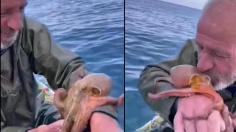 Aydın’ın Didim ilçesinde bir balıkçı, ağına takılan ahtapotu öperek sevdi ve tekrar denize bıraktı.