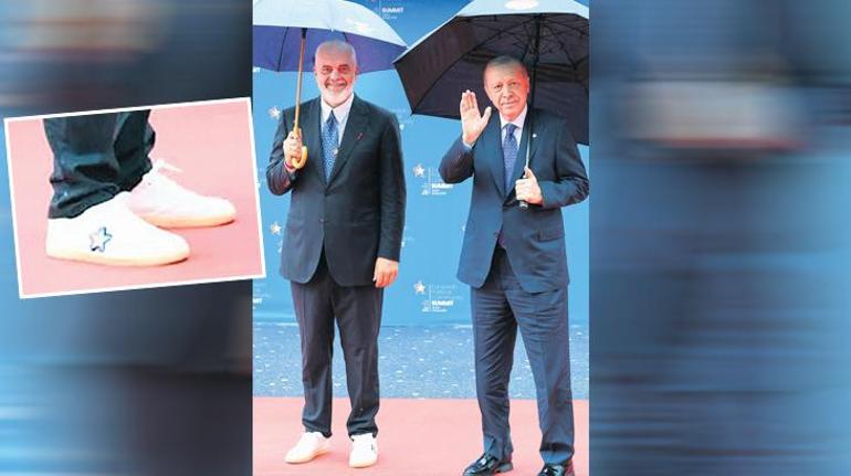 Arnavutluk Başbakanı Edi Rama’nın beyaz spor ayakkabı giymesi Cumhurbaşkanı Erdoğan’ın dikkatinden kaçmadı. İki başkanın yağmur altındaki buluşmasında Rama’nın ayakkabılarını işaret eden Erdoğan, “Spor ayakkabısı giyiyorsun” dediği duyuldu.