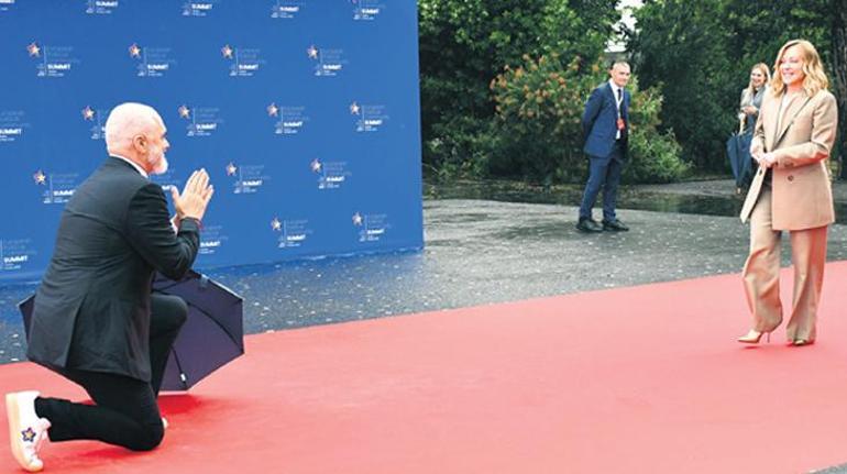Ev sahibi Arnavutluk Başbakanı Edi Rama, İtalya Başbakanı Meloni’yi kırmızı halıda diz çökerek karşıladı. Şaşkınlığını gizleyemeyen Meloni, “Bunu benim boyumda olmak için yapıyor” dedi. Rama 2.01, Meloni 1.58 cm uzunluğunda.