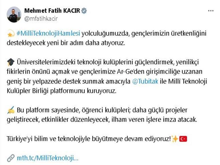 Sanayi ve Teknoloji Bakanı Mehmet Fatih Kacır, Türkiye Bilimsel Teknolojik Araştırmalar Kurumu’yla (TÜBİTAK) iş birliğinde Milli Teknoloji Kulüpler Birliği Platformu’nu kurduklarını belirterek, “Bu platform sayesinde, öğrenci kulüpleri; daha güçlü projeler geliştirecek, etkinlikler düzenleyecek, ilham veren işlere imza atacak” dedi.