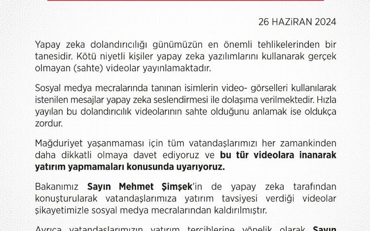 “Hızla yayılan bu dolandırıcılık videolarının sahte olduğunu anlamak oldukça zordur. Mağduriyet yaşanmaması için tüm vatandaşlarımızı her zamankinden daha dikkatli olmaya davet ediyoruz ve bu tür videolara inanarak yatırım yapmamaları konusunda uyarıyoruz. Bakanımız Sayın Mehmet Şimşek’in de yapay zeka tarafından konuşturularak vatandaşlarımıza yatırım tavsiyesi vermiş gibi gösterildiği videolar şikayetimizle sosyal medya mecralarından kaldırılmıştır. Ayrıca vatandaşlarımızın yatırım tercihlerine yönelik olarak Sayın Bakanımızın herhangi bir tavsiyesi olmayacağı da aşikardır.”