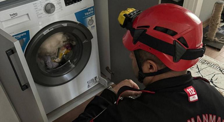 Çalışan çamaşır makinesinde sıkışan kedinin imdadına itfaiye koştu