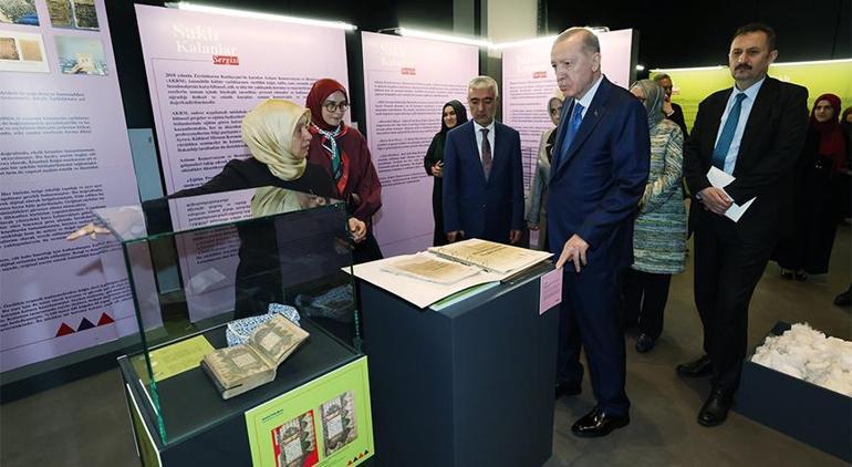 Cumhurbaşkanı Erdoğan, bir mühlet evvel eşi Emine Erdoğan’ın açılışını yaptığı, Kahramanmaraş’ta gizli kalmış bohçadan çıkan 40 kitabın sergilendiği ve onarım sürecinde yerli el üretimi kağıtların kullanılmasıyla Türkiye’de bir unsur imza atılan “Saklı Kalanlar” standını gezdi. Ziyarete ait, Erdoğan’ın toplumsal medya hesabından paylaşım yapıldı.