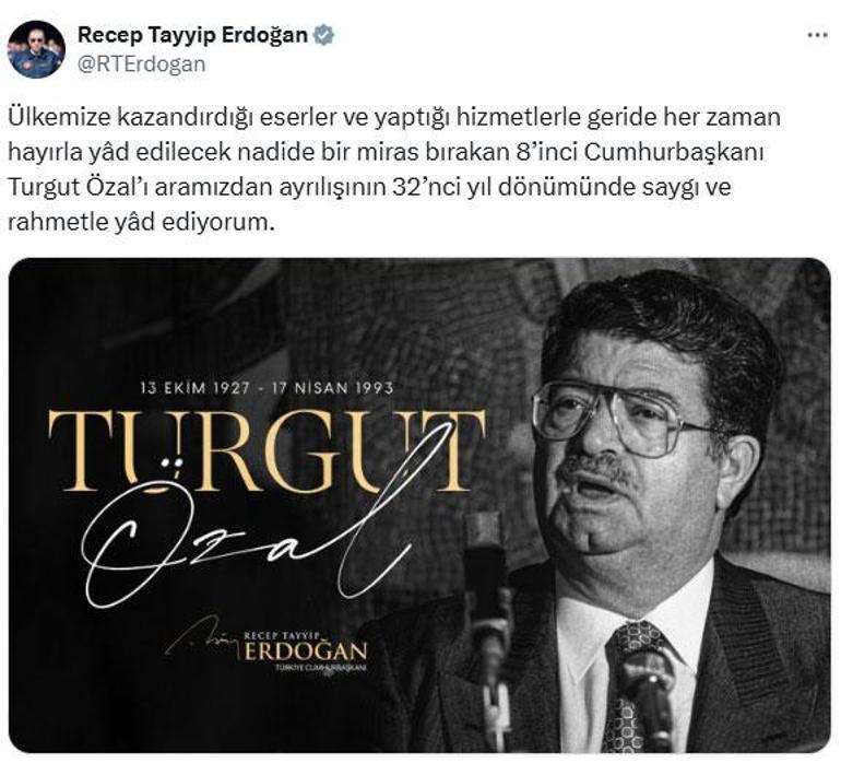 Cumhurbaşkanı Erdoğan, paylaşımında, “Ülkemize kazandırdığı eserler ve yaptığı hizmetlerle geride her vakit hayırla yâd edilecek nadide bir miras bırakan 8’inci Cumhurbaşkanı Turgut Özal’ı ortamızdan ayrılışının 32’nci yıl dönümünde hürmet ve rahmetle yâd ediyorum” tabirlerine verdi.