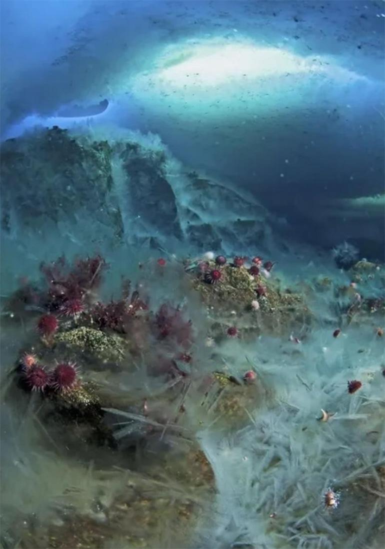 Birkaç yıl evvel BBC’nin ‘Dünya’nın Harika Mevsimleri‘ isimli bir belgesel serisinde yayınlanan kısımda uzmanlar daha evvel duydukları lakin bir türlü bulamadıkları ‘ölüm parmağı’nı sonunda buldular. Sinema grubu mevt parmaklarından birinin oluşumunu, ürkütücü bir biçimde deniz tabanına hakikat sürünerek ilerlerken ve dokunduğunda yoluna çıkan her şeyi dondururken yakalamayı başardı. Çok soğuk ve hava tüplerini değiştirme mecburiliği nedeniyle dalgıçlar tüm bir olayı fotoğraflamaya yetecek kadar uzun mühlet aşağıda kalamadılar lakin yeniden de okyanusun derinlerinde olup bitenleri gözlemleyebildiler. BBC’nin kadrajından tüm dünyaya gösterilen bu manzaralar birinci izleyen biri için bir bilim kurgu sinemasının kesimi üzere hissettirebiliyor lakin bu imgelerin başkahramanı denizin yüzeyinden içine giren, birkaç saat içinde büyüyen ve içinde tuzlu su bulunan bir buz tüpü, yani brinikül. Bizim bildiğimiz ismiyle ‘ölüm parmağı.’