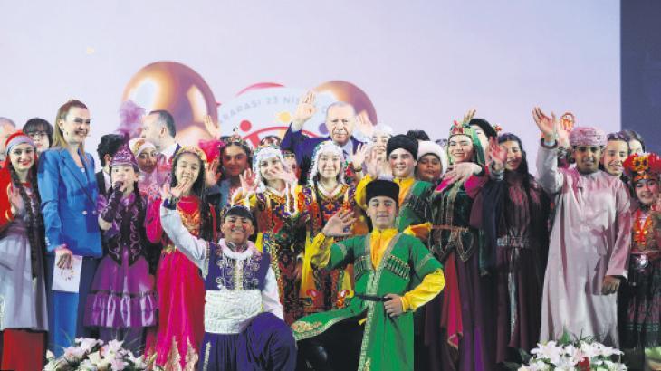 Cumhurbaşkanı Erdoğan’ın konuşmasının akabinde sahneye dünya çocukları davet edildi. Kırgızistan’dan gelen çocuklar 23 Nisan müziğini söylerken, Erdoğan da sahnede çocuklarla kameralara poz verdi. 30 ülkeden 600 çocuk, kendi fotoğrafları ile Cumhurbaşkanı Erdoğan’ın çocuklara olan sevgisini gösteren bir kolaj hazırladı. Bu tablo TRT Genel Müdür Zahid Sobacı tarafından Erdoğan’a takdim edildi. Ayrıyeten çocukların 23 Nisan ile ilgili his ve niyetlerinin yer aldığı kitap da Erdoğan’a armağan edildi.