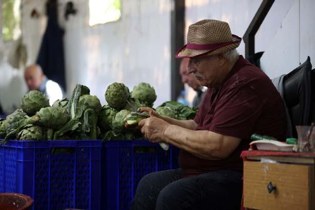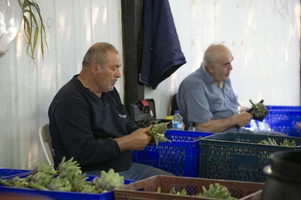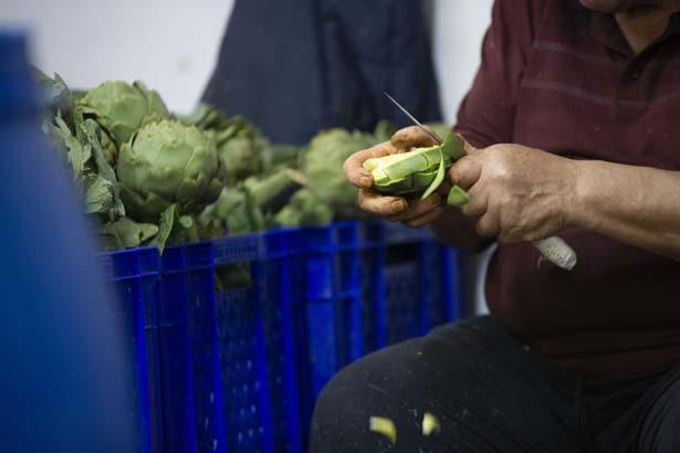“Güçlü bir grubumuz var. Bu güçlü grubu görünce daha çok iştahlanıyorum. Takım daima tıpkı. Bu iş sanat, bu işin makinesini de getirdiler soymak için lakin bu el emeği. İtalya’dan o kadar para verip getirdiler lakin olmuyor, illa el emeği. Eksiğini gediğini görüyorsun, bıçağı kullanacağın yeri biliyorsun. Bu tim her sene burada grup olarak hazır olur. Askerlikte tim var ya burada da enginar timi var. Enginarın etrafındaki etine, kabuğuna dikkat ediyorsun. Soyan kişi enginarın etine girmeden ona dikkat edecek. Bizim bıçaklar çok keskin. Özel yapılıyor. Dikkat etmezsen parmaklarını keser.”