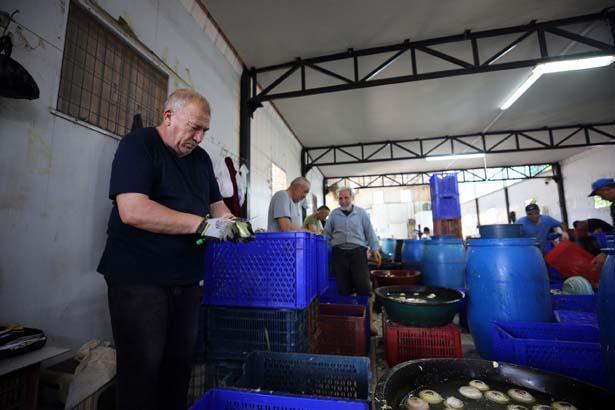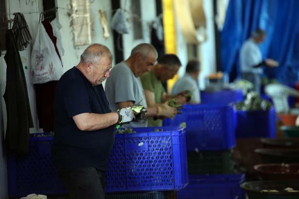 Ekipten Mahmut Özdemir de işlerinde bıçağın sertliğinin çok değerli olduğunu lisana getirerek, “Bu bıçak keskin olmazsa tek bir tane soyamazsın. Bir enginarı en geç 1 dakikada soyman lazım yoksa kararır. Kararınca da iz yapar. Gözü kapalı da soyabiliyoruz. Bakmadan soymak bu bıçaklarla acemi işi değil.” dedi.