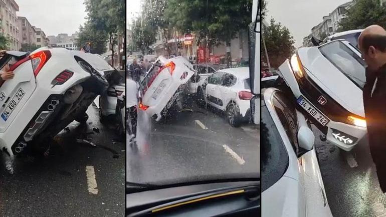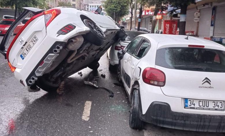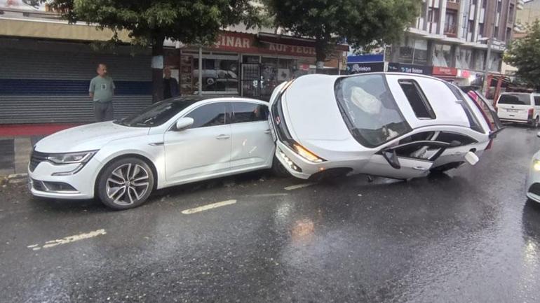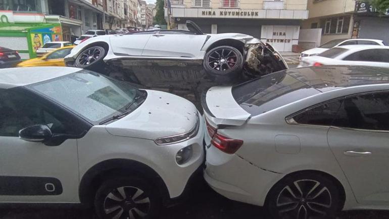 Esenyurt’ta feci kaza! Araba park halindeki aracın üzerine uçtu