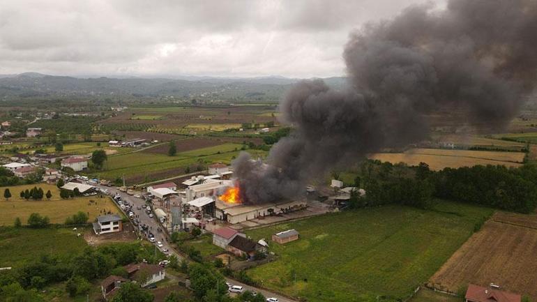 Sakarya’nın Karasu ilçesi Adatepe Mahallesi’nde fındık kırım fabrikasında çıkan, itfaiye takımlarının müdahalesiyle 2,5 saatte denetim altına yangın, havadan görüntülendi.