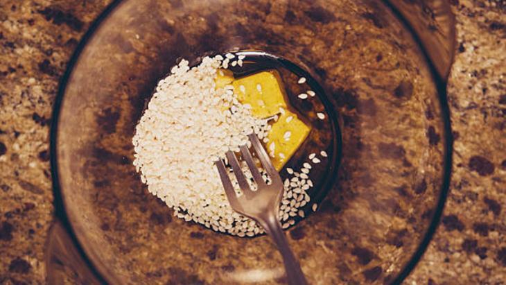 Küçük bir fırın kabını yağlı kâğıtla kaplayın yahut yavaşça yağlayarak başlayın. Küçük bir tencereye balı, tereyağını ve şekeri alın ve kısık ateşte karıştırarak bal büsbütün eriyip hafif kabarcıklar çıkarana kadar ısıtın. Şeker kullanıyorsanız eriyene kadar devam etmelisiniz. Altını kapatıp çabucak içine kavrulmuş susamları ekleyin ve süratlice karıştırmalısınız. İsterseniz bu etapta tarçın yahut vanilya da ekleyebilirsiniz.