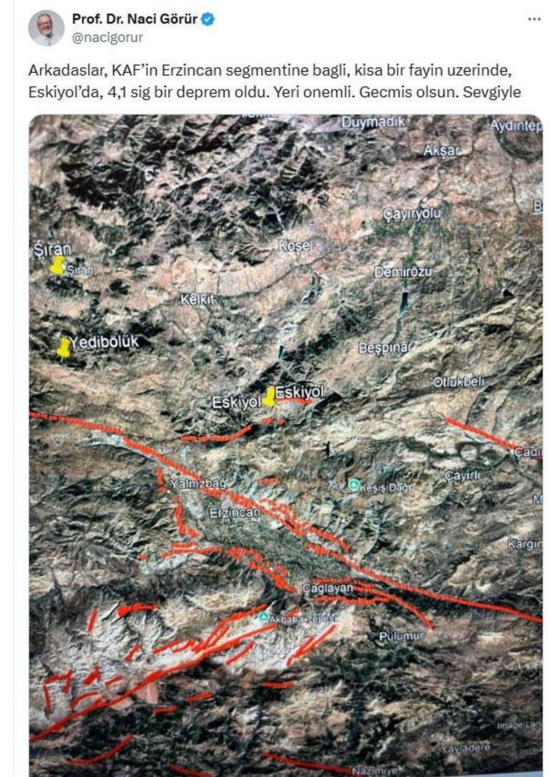 Yer Bilimci Prof. Dr. Naci Görür zelzele sonrası açıklama yaptı. Toplumsal medya hesabından paylaşım yapan Görür şunları söyledi: “Arkadaşlar, KAF’in Erzincan segmentine bağlı, kısa bir fayın üzerinde, Eskiyol’da, 4,1 sığ bir zelzele oldu. Yeri değerli. Geçmiş olsun”