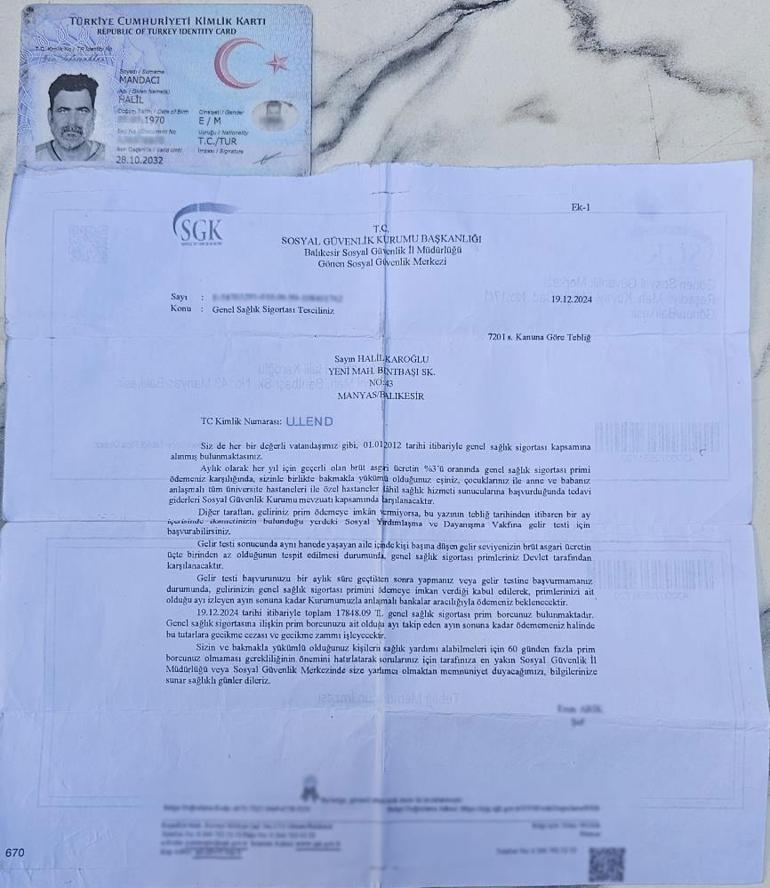 Mandacı, “Son olarak 19 Aralık 2024 tarihinde Balıkesir Sosyal Güvenlik İl Müdürlüğü Gönen Toplumsal Güvenlik Merkezi’nden Halil Karaoğlu ismine bir ceza kağıdı geldi. Kelamda sigortalı olarak çalışmışım fakat Halil Karaoğlu ismiyle değil, Halil Mandacı ismiyle. Yetkililer bu durumu, ‘Fark etmez, her iki isim de sensin’ diyerek yorumladı. Artık bu cezayla uğraşıyorum ve ne yapacağımı bilmiyorum. İki kere mahkemeye başvurdum sonuç alamadım. Cezanın ölçüsü 18 bin lira. Daima cezalar geliyor ancak bu durumu nasıl çözeceğimi bilmiyorum. Olağan çift kimlikle yaşamak yerine tek kimlikle yaşamak istiyorum” dedi.