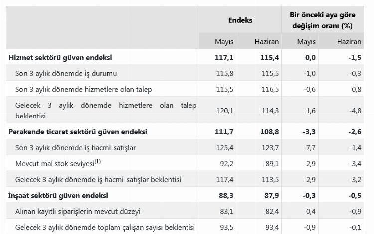 Mevsim etkilerinden arındırılmış güven endeksi Haziran ayında bir önceki aya göre; hizmet sektöründe yüzde 1,5 oranında azalarak 115,4 değerini, perakende ticaret sektöründe yüzde 2,6 oranında azalarak 108,8 değerini ve inşaat sektöründe yüzde 0,5 oranında azalarak 87,9 değerini aldı.