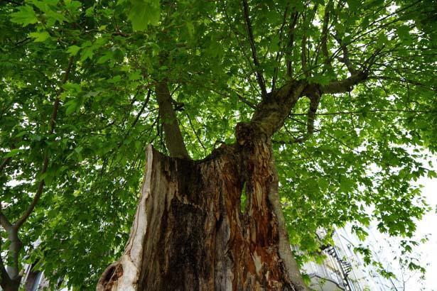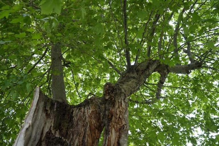 Samsun’un İlkadım ilçesinde dışarıdan bakıldığında içi büsbütün boş ve yalnızca dış kabukla ayakta kalan çınar ağacı, üst kısımlarındaki yeşilliklerle tabiata tutunmaya devam ediyor.
