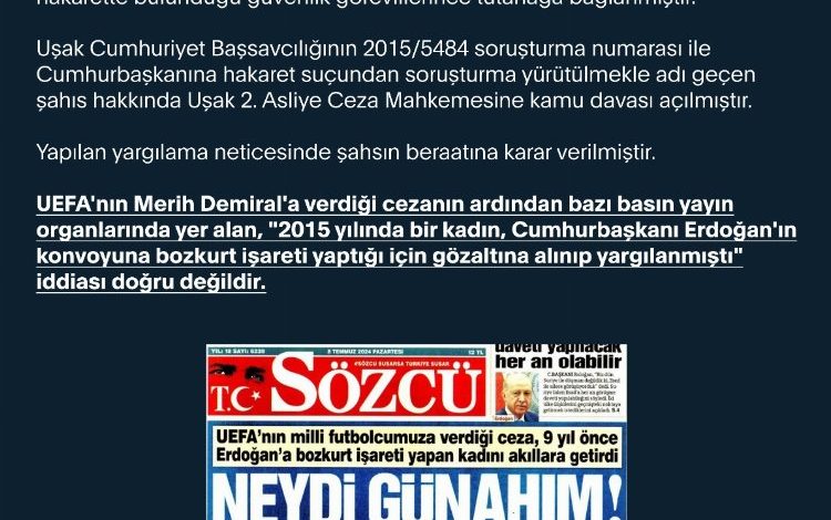 Bahse konu haberde geçen iddia ve yargılama sürecinde “bozkurt işareti” herhangi bir şekilde söz konusu olmadığının altı çizilen açıklamada, “Cumhurbaşkanı Sayın Recep Tayyip Erdoğan’ın 28 Mayıs 2015 tarihinde Uşak ili ziyareti esnasında S.K isimli şahıs, Cumhurbaşkanımıza hitaben sözle hakarette bulunduğu güvenlik görevlilerince tutanağa bağlanmıştır. Uşak Cumhuriyet Başsavcılığının 2015/5484 soruşturma numarası ile Cumhurbaşkanına hakaret suçundan soruşturma yürütülmekle adı geçen şahıs hakkında Uşak 2. Asliye Ceza Mahkemesine kamu davası açılmıştır. Yapılan yargılama neticesinde şahsın beraatına karar verilmiştir” ifadeleri yer aldı.