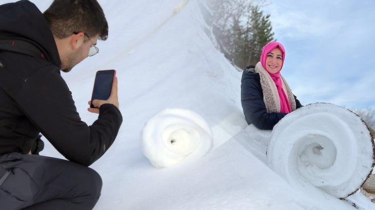 Amasya’nın Taşova ilçesine bağlı bin 200 rakımlı Dereli Ormanı’nda Nisan ayında beklenmedik biçimde yağan kar yağışı sonrası tabiatta az görülen kar ruloları oluştu.