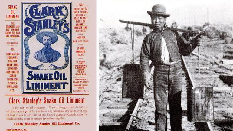 Takvimler 1893 yılını gösteriyordu. Clark Stanley isimli kişi Chicago Dünya Fuarı’nda bir eser tanıttı. Bu eser ‘çıngıraklı yılan yağı’nın ta kendisiydi. Başlarda Çin’den Amerika Birleşik Devletleri’ne göç eden demir yolu personellerinin, uzun ve şiddetli çalışma günlerinden sonra eklemlerini rahatlatmak için kullanılan bu yağ işe yarıyordu. Lakin yılan yağı dolandırıcıların eline düştükten sonra olanlar oldu. 19. yüzyılın ortalarında, yaklaşık 180 bin Çinli emekçi çalışmak için ABD’ye geldi. Hayli kuvvetli koşullarda çalışan bu emekçiler hem düşük fiyatlara çalışıyor hem de harcadıkları fizikî güçle bedenlerinde önemli ağrılar yaşıyordu. Çinli demir yolu personelleri bu ağrılarla başa çıkabilmek için kendi ülkelerinden çeşitli ilaçlar getirdiler. Bunlardan bir tanesi de yılan yağıydı.