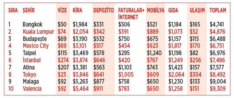 Uluslararası para transferi hizmeti Remitly’de seyahat ve finans müellifi George Driscoll tarafından şimdiye kadar yapılan kent ömür standartları araştırmalarından derlenen listede kentler, vize maliyeti, kira, depozito, faturalar, mobilya, besin ve ulaşım harcamalarına nazaran sıralandı. Birinci sırada Tayland’ın başşehri Bangkok 4 bin 741 dolarla yer aldı. İkinci sırada 4 bin 876 dolarla Malezya’nın başşehri Kuala Lumpur yer alırken, Macaristan’ın başşehri Budapeşte 6 bin 488 dolarla üçüncü, Meksika’nın başşehri Mexico City 6 bin 751 dolarla dördüncü, Tayvan’ın başşehri Taipei 6 bin 976 dolarla beşinci oldu. İstanbul ise 7 bin 486 dolarla altıncı sırada yer aldı. İstanbul’u 7 bin 577 dolarla Yunanistan’ın başşehri Atina izledi. Yeni bir hayata başlamak için en değerli kent ise 24 bin 791 dolarla New York oldu. Onu 22 bin 84 dolarla Zürih ve 21 bin 42 dolarla Londra izledi.