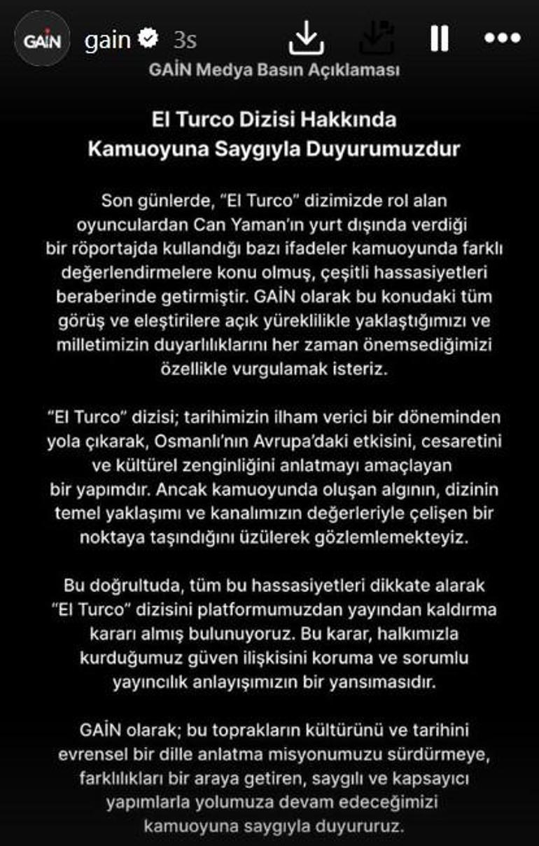 “Son günlerde ‘El Turco’ dizimizde rol alan oyunculardan Can Yaman’ın yurtdışında verdiği bir röportajda kullandığı kimi sözler kamuoyunda farklı değerlendirmelere husus olmuş, çeşitli hassasiyetleri beraberinde getirmiştir. GAİN olarak bu husustaki tüm görüş ve tenkitlere açık yüreklilikle yaklaştığımızı ve milletimizin hassaslıklarını her vakit önemsediğimizi bilhassa vurgulamak isteriz.