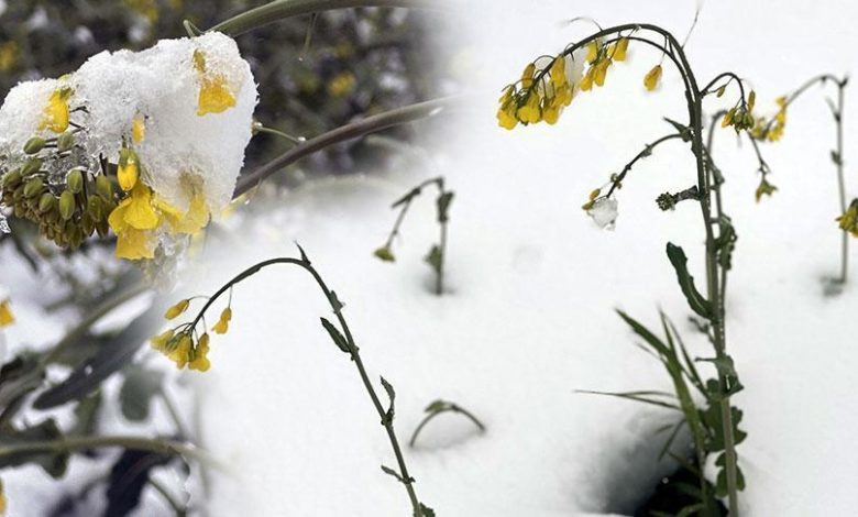 Trakya’nın yüksek kısımlarına 8 Nisan’da kar yağdı, geceleri hava sıcaklığı mevsim normallerinin 8-10 derece altına düştü. Bölgede eksi derecelere düşen sıcaklık nedeniyle zirai don yaşandı. Son günlerde Trakya tarlalarını sarıya boyayan ve çiftçinin ‘sarı altın çiçek’ olarak isimlendirdiği ve ayçiçeğine alternatif olarak ekilen kanolalar kar altında kaldı. Üretici kanaloda zirai don kaygısı yaşarken, kanola boynunu aşağıya yanlışsız büküp çiçeklerini dondan korudu.