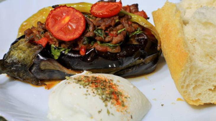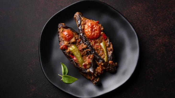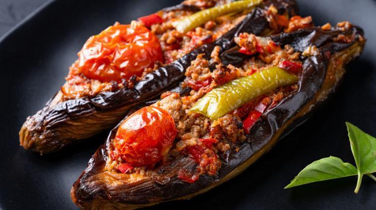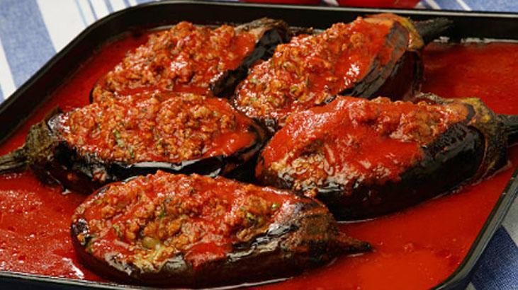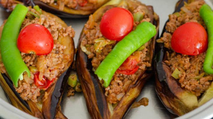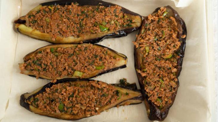 Doğranmış yeşil biberleri ve domatesleri ek edin. Salça, tuz ve baharatları ekleyerek karıştırın. Az ölçüde su ekleyerek harcı bir müddet daha pişirin ve ocaktan alın. Fırında pişen patlıcanların ortasını yavaşça açarak kıymalı harçla doldurun. Akabinde bir borcama yerleştirin. Üzerlerini domates dilimleri, biber ve sarımsakla süsleyin.