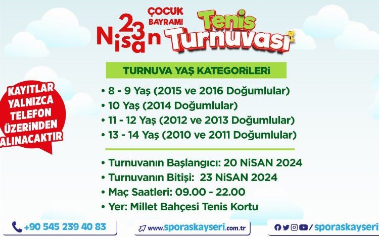Kayseri Büyükşehir Belediye Başkanı Dr. Memduh Büyükkılıç’ın talimatları doğrultusunda çocukların bu özel gününe özel bir etkinlikle hazırlanan Spor A.Ş. 23 Nisan Ulusal Egemenlik ve Çocuk Bayramı’na özel tenis turnuvası ile çocuklara spor ve eğlence dolu bir bayram yaşatacak.