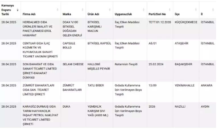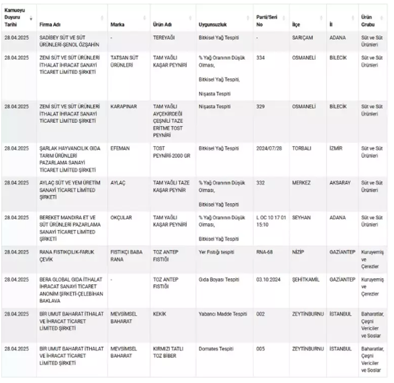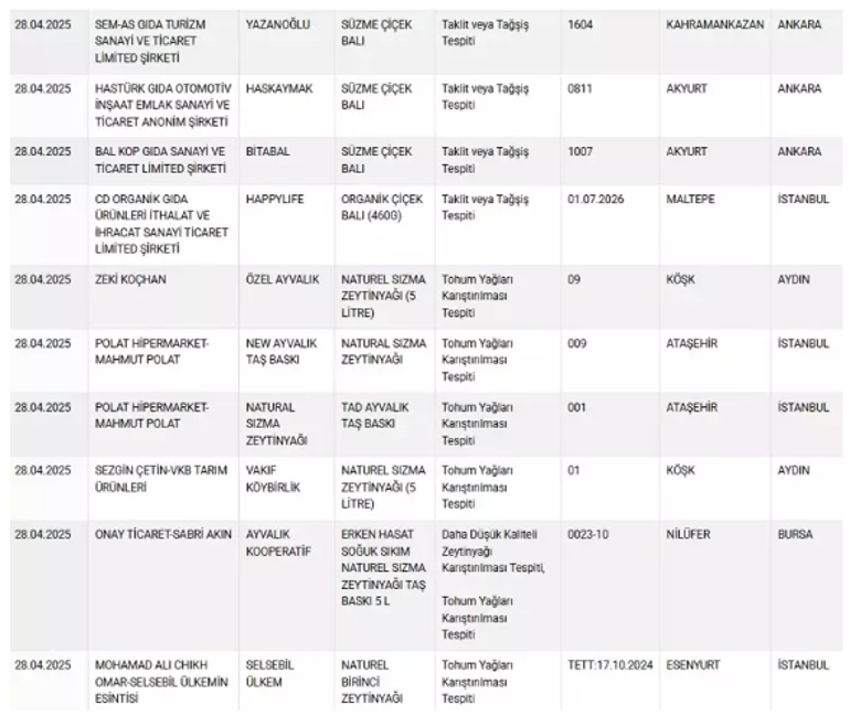 Herkesin ilgisini çeken sıhhati tehlikeye atan ve taklit-tağşiş yapılan eserlere her geçen gün yenisi ekleniyor. Vatandaşların sağlıklı besine erişmesi için Tarım ve Orman Bakanlığı yaptığı denetimler sonrası uygunsuz olan eserleri ifşa etmeye devam ediyor. Son yapılan güncellemeyle birlikte birçok eser listeye dahil edildi ve üreticileri açıklandı.