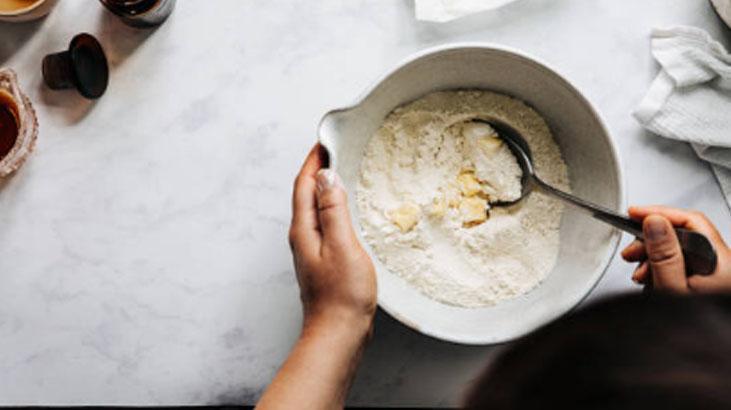 Kek için kritik bir gereç olan un, yavaş yavaş eklenmeli. Bu tanımda 250 gram unu iki etapta dökmeniz gerekiyor. Bu sayede pürüzsüz bir karışım elde etmiş oluyorsunuz. Pürüzsüz ve topaksız kalmasına yardımcı olan karışıma kabartma tozunu ek edin. Böylelikle hamurunuz hazır hale gelecek.