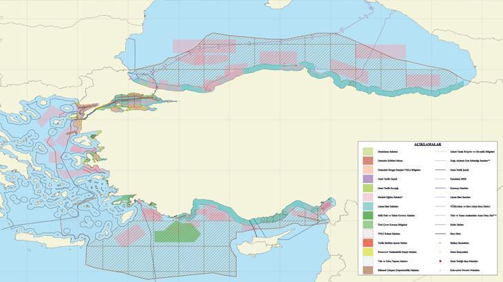 Doğu Akdeniz kıta sahanlığı ve Karadeniz münhasır ekonomik bölge sonları dahilinde Türkiye Petrolleri Anonim İştiraki (TPAO) ruhsat alanlarının geniş bir formda yer aldığı haritada, özel etraf muhafaza bölgeleri ve bilimsel araştırma alanlarının da geniş bir biçimde yer aldığı görüldü.