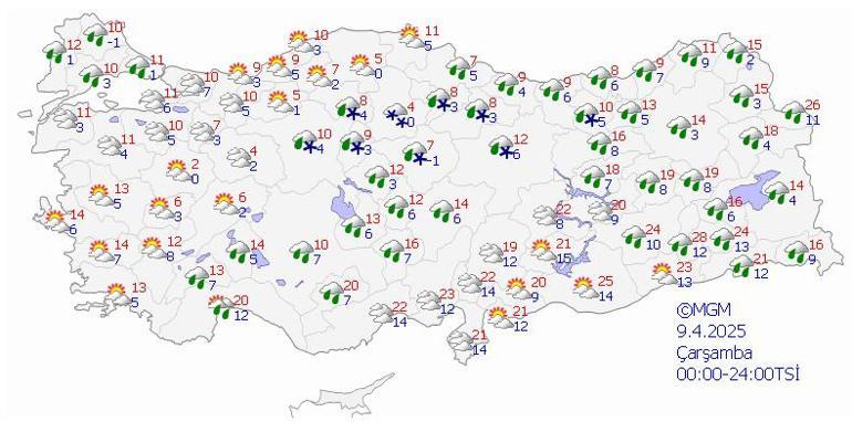 Parçalı ve çok bulutlu, aralıklı yağmur ve sağanak yağışlı, yüksekleri karla karışık yağmurlu