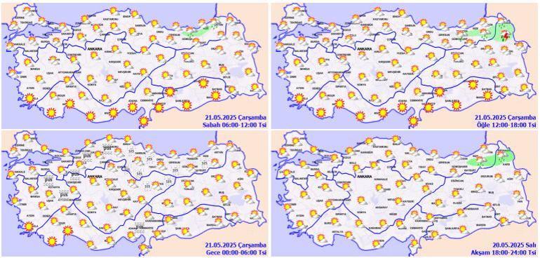 Meteoroloji Genel Müdürlüğü tarafından yapılan kestirimlere nazaran: Ülkemiz genelinin modüllü ve çok bulutlu, Marmara, Kuzey Ege, Karadeniz, İç Anadolu’nun kuzeybatı ve doğu, Doğu Anadolu’nun kuzey bölümleri ile Adana etraflarının sağanak ve gök gürültülü sağanak yağışlı geçeceği iddia ediliyor. Yağışların, Marmara’nın güneydoğusu ve Batı Karadeniz’de yer yer kuvvetli olması bekleniyor. Doğu Akdeniz, Güneydoğu Anadolu ve İç Anadolu’da toz taşınımı bekleniyor.