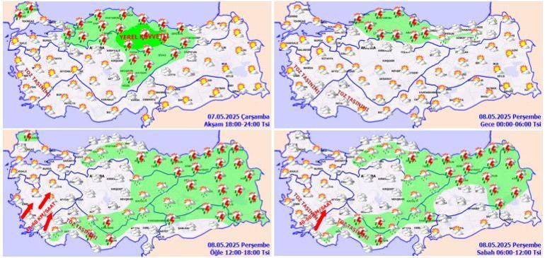 Parçalı ve çok bulutlu, Akdeniz’in Toroslor mevkii, Kahramanmaraş etrafları ile Antalya’nın iç kısımlarının lokal olmak üzere sağanak ve gök gürültülü sağanak yağışlı geçeceği varsayım ediliyor. Batı Akdeniz’de toz taşınımı bekleniyor.