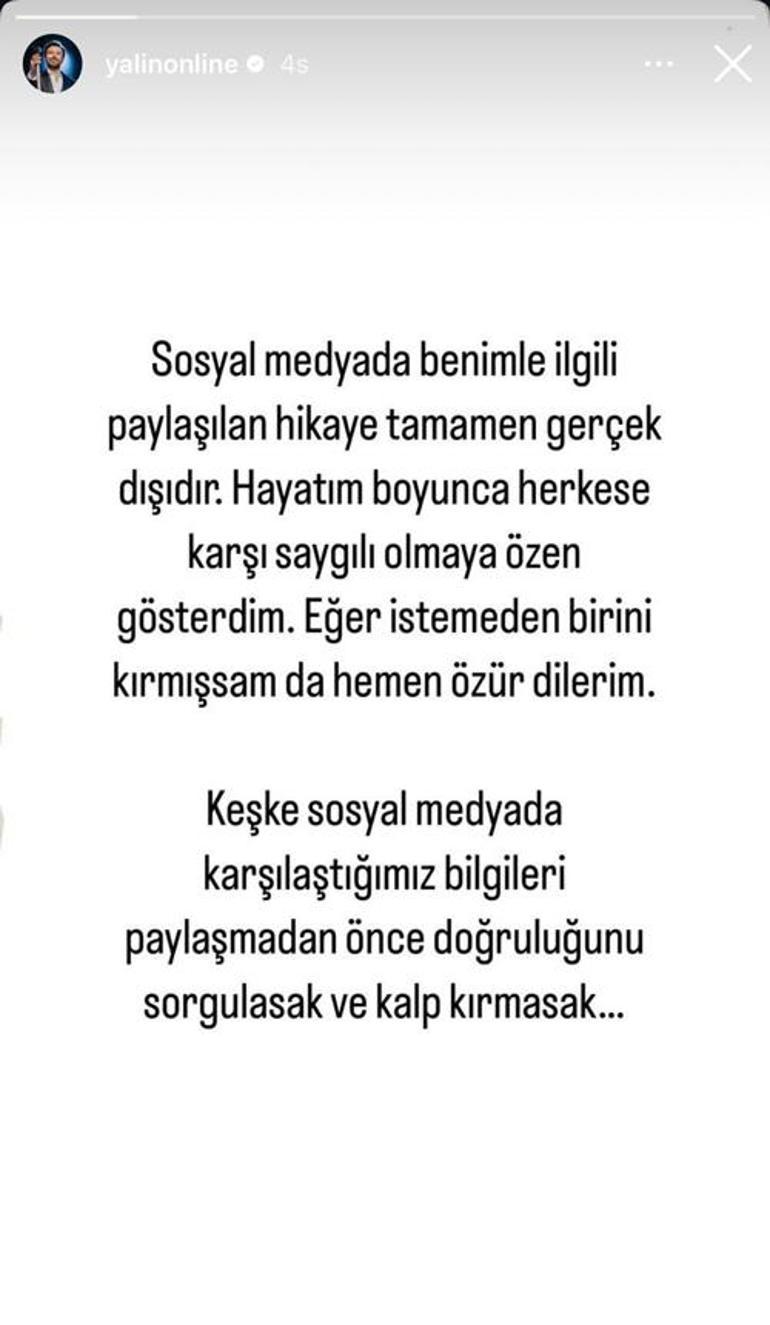 İddialar toplumsal medyanın gündemine otururken Yalın’dan savlara karşılık geldi. Instagram hesabından paylaşım yapan 45 yaşındaki ünlü müzikçi, “Sosyal medyada benimle ilgili paylaşılan öykü büsbütün gerçek dışıdır. Hayatım boyunca herkese karşı saygılı olmaya itina gösterdim. Şayet istemeden birini kırmışsam da çabucak özür dilerim. Keşke toplumsal medyada karşılaştığımız bilgileri paylaşmadan evvel doğruluğunu sorgulasak ve kalp kırmasak…” dedi.
