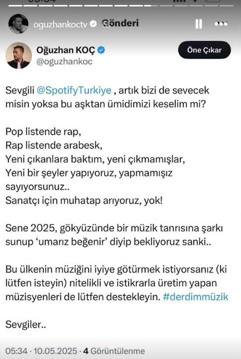 Oğuzhan Koç da toplumsal medya hesabından hususa ait yaptığı paylaşımda, “Sevgili Spotify Türkiye, artık bizi de sevecek misin yoksa bu aşktan ümidimizi keselim mi? Pop listende rap, rap listende arabesk, yeni çıkanlara baktım, yeni çıkmamışlar, yeni bir şeyler yapıyoruz, yapmamışız sayıyorsunuz. Sanatçı için muhatap arıyoruz, yok. Sene 2025, gökyüzünde bir müzik ilahına müzik sunup ‘umarız beğenir’ deyip bekliyoruz güya. Bu ülkenin müziğini düzgüne götürmek istiyorsanız (ki lütfen isteyin) nitelikli ve istikrarla üretim yapan müzisyenleri de lütfen destekleyin.” dedi.