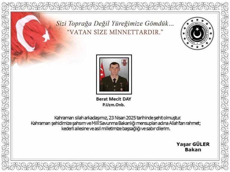 “Pençe-Kilit Operasyonu bölgesinde, 22 Nisan’da terör örgütü mensupları tarafından yapılan taarruz sonucu ağır yaralanan kahraman silah arkadaşımız Piyade Uzman Onbaşı Berat Mecit Day, Işıklı Sahra Hastanesinde yapılan tüm müdahalelere karşın kurtarılamayarak 23 Nisan’da şehit olmuştur. Bizleri derin bir acı ve ıstıraba boğan bu olayda hayatını kaybeden aziz şehidimize Allah’tan rahmet, kederli ailesine, Türk Silahlı Kuvvetleri ile asil milletimize başsağlığı ve sabır dileriz.”