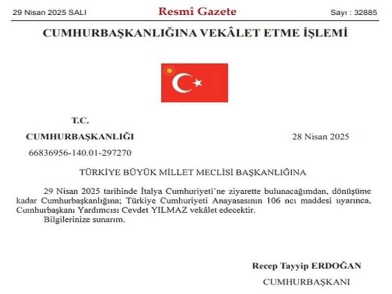 Cumhurbaşkanlığına, Cumhurbaşkanı Yardımcısı Yılmaz’ın vekalet etmesine dair tezkere, Resmi Gazete’de yayımlandı. Tezkereye nazaran, Cumhurbaşkanı Erdoğan 29 Nisan’da İtalya’yı ziyarette bulunacağından, dönüşüne kadar Cumhurbaşkanlığına; Türkiye Cumhuriyeti Anayasasının 106’ncı hususu uyarınca, Cumhurbaşkanı Yardımcısı Cevdet Yılmaz vekalet edecek.