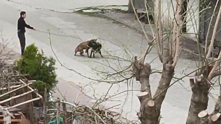 Öte yandan cep telefonu ile kaydedilen imajlarda bir şahsın tasmasından tuttuğu köpeğini öbür sokak köpeklerinin üzerine saldığını ve köpeklerin birinci evvel bir müddet havladığı, sonrasında ise hengame ettikleri anlar yer aldı.