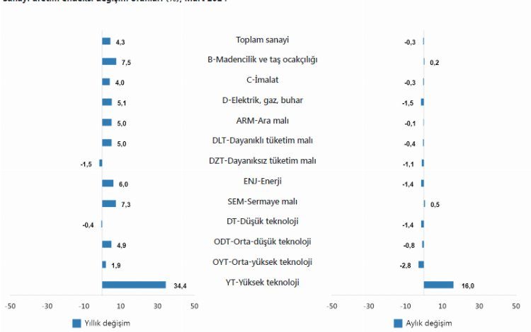 Sanayinin alt sektörleri incelendiğinde, 2024 yılı Mart ayında madencilik ve taş ocakçılığı sektörü endeksi bir önceki yılın aynı ayına göre yüzde 7,5 artarken, imalat sanayi sektörü endeksi yüzde 4,0, elektrik, gaz, buhar ve iklimlendirme üretimi ve dağıtımı sektörü endeksi de yüzde 5,1 oranında arttı.