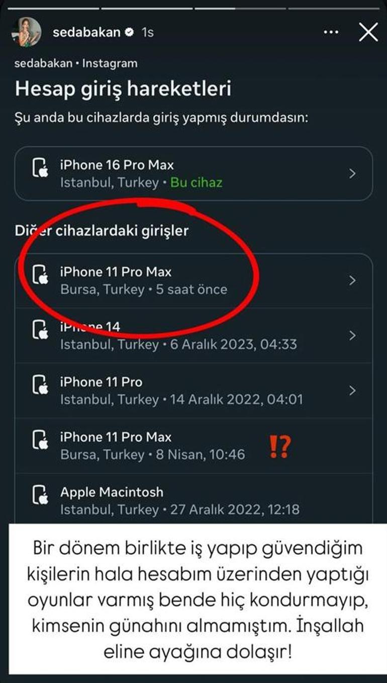 Bu olay yaşandıktan saatler sonra Bakan’dan yeni paylaşım geldi. Bakan, Instagram hesabına birilerinin girdiğini açıkladı. Bir ekran manzarası paylaşan oyuncu, “Bir periyot birlikte iş yapıp güvendiğim bireylerin hala hesabım üzerinden yaptığı oyunlar varmış, ben de hiç konduramayıp, kimsenin günahını almamıştım. İnşallah elin ayağına dolaşır!” dedi.