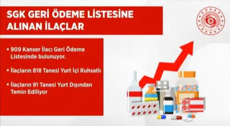 Geri ödeme kapsamında yer alan ilaçlardan kelam etmek isterim. Bilhassa kanser tedavisine kullanılan ilaç sayısı 818. 91 adedi de yurt dışından temin edilen ilaçlar olmak üzere 909 adet. Toplumsal güvenlik geri ödeme listesine dahil ettiğimiz ilaç sayısı. Bugün itibariyle geri ödeme kapsamında alınan ilaçlarımızın sayısını kurullarımızın belirlediği prensipler doğrultusunda giderek arttırıyoruz.