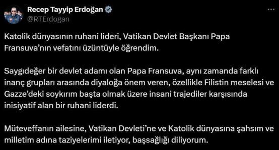Cumhurbaşkanı Erdoğan iletisinde, “Katolik dünyasının ruhani lideri, Vatikan Devlet Başkanı Papa Fransuva’nın vefatını ıstırapla öğrendim.