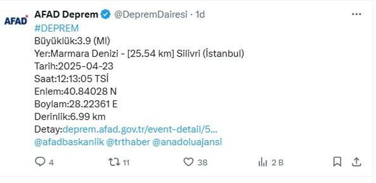 Afet ve Acil Durum İdaresi Başkanlığının (AFAD) internet sitesinde yer alan bilgiye nazaran, Silivri açıklarında sarsıntı oldu.