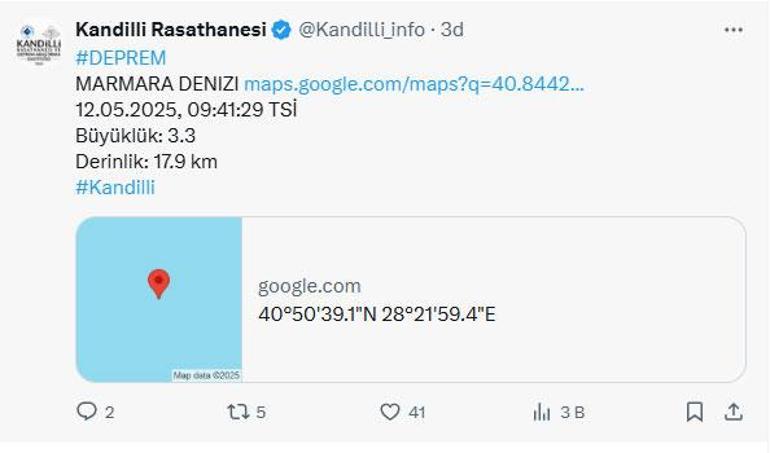 Kandilli Rasathanesi’nin toplumsal medya hesabından yapılan açıklamaya nazaran, Marmara Denizi’nde saat 09.41’de büyüklüğü 3.3 olarak belirlenen bir sarsıntı meydana geldi.