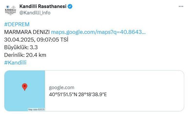 Kandilli Rasathanesi, Marmara Denizi’nde 3.3 büyüklüğünde zelzele meydana geldiğini duyurdu.
